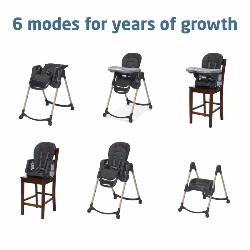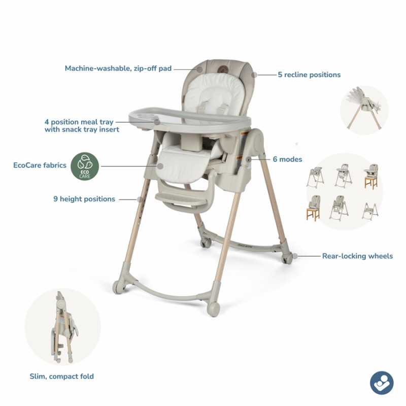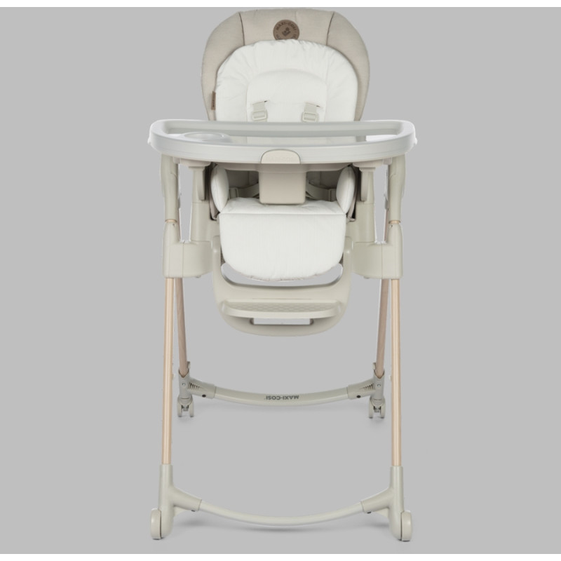Maxi-Cosi Minla está llena de funcionalidades, con sus cinco posiciones de reclinación para mayor comodidad, cuatro posiciones de la bandeja de comida y nueve niveles de altura, puede utilizarlo como asiento infantil gracias al acogedor cojín para los más pequeños, como una silla alta o como un asiento elevado con bandeja para ubicarlo en cualquier silla. Las posibilidades de tener a su hijo junto a usted en la mesa son infinitas. ¿Un ajuste personalizado a medida que su hijo crece? Lo conseguirás con la silla de alimentación Minla 6 en 1.