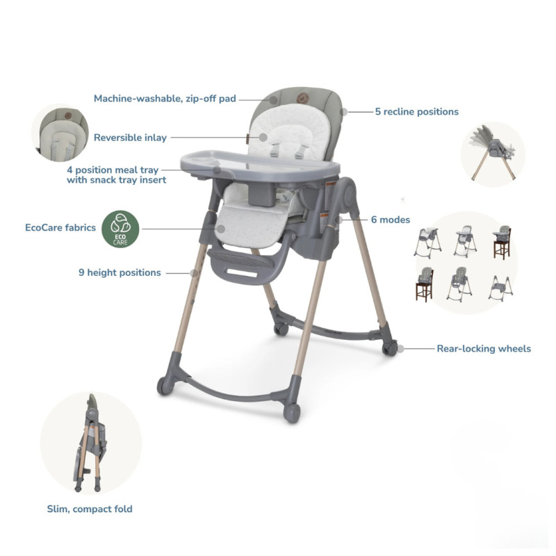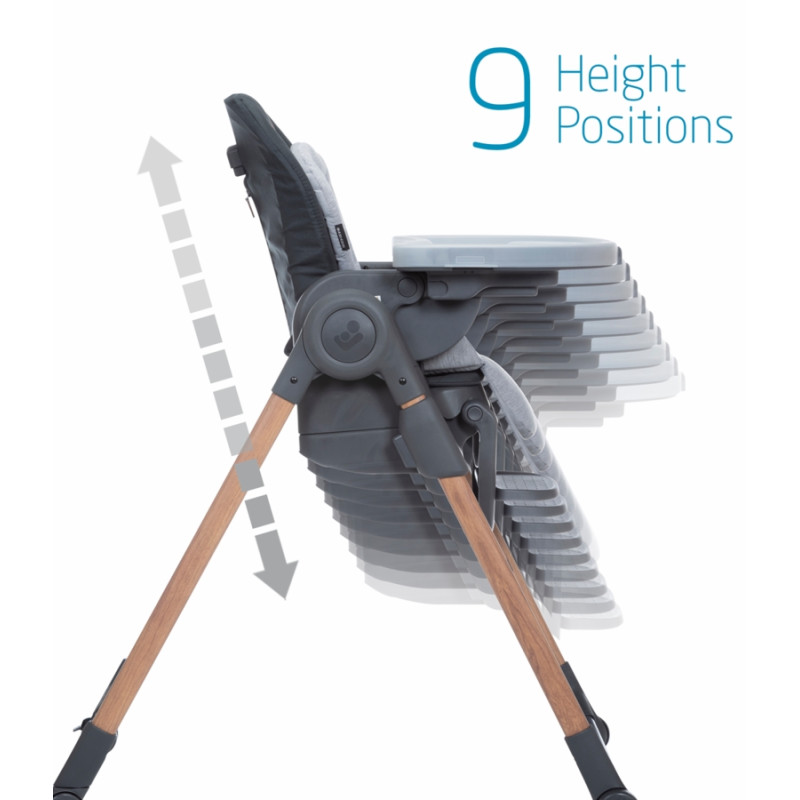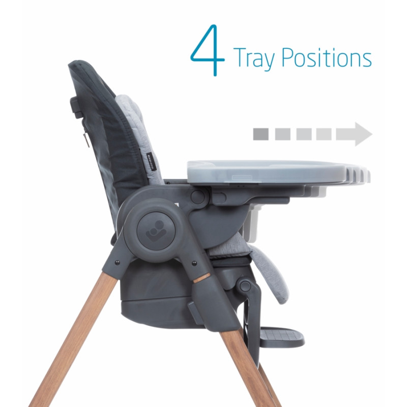 Maxi-Cosi Minla está llena de funcionalidades, con sus cinco posiciones de reclinación para mayor comodidad, cuatro posiciones de la bandeja de comida y nueve niveles de altura, puede utilizarlo como asiento infantil gracias al acogedor cojín para los más pequeños, como una silla alta o como un asiento elevado con bandeja para ubicarlo en cualquier silla. Las posibilidades de tener a su hijo junto a usted en la mesa son infinitas. ¿Un ajuste personalizado a medida que su hijo crece? Lo conseguirás con la silla de alimentación Minla 6 en 1.