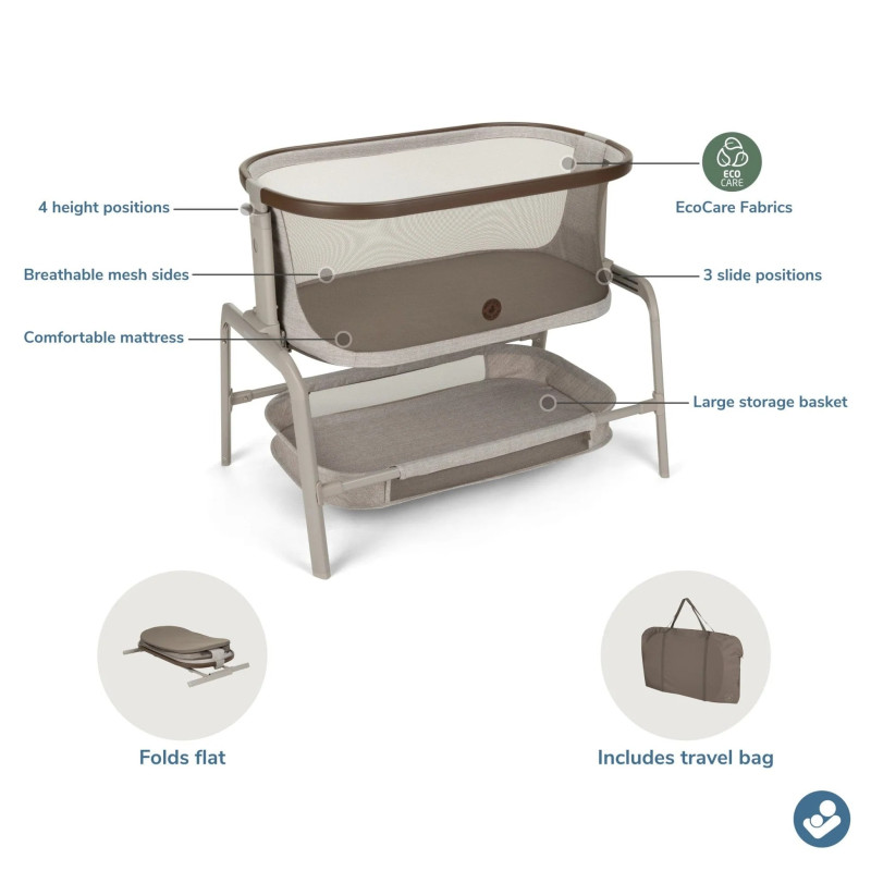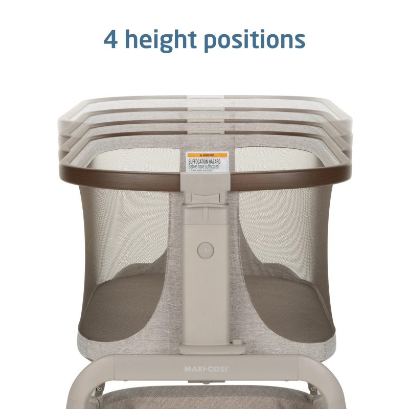 La versatilidad también es importante. Todo eso es gracias a las cinco posiciones de altura diferentes del Iora que le brindan un ajuste personalizado. El Iora no solo se ajusta hacia arriba y hacia abajo, sino también de lado a lado. Para esos momentos en medio de la noche en los que su bebé se despierta llorando, puede deslizar fácilmente el moisés más cerca de la cama para brindarle comodidad y cuidado.