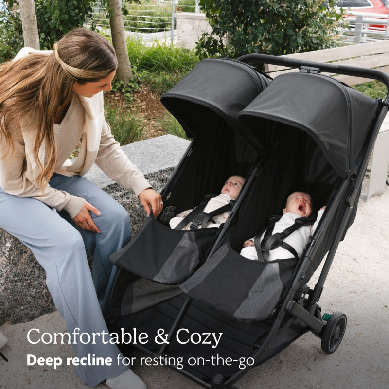 El UPPAbaby Minu Duo es un coche compacto y versátil, con asientos lado a lado diseñado para llevar dos niños, desde recién nacidos hasta bebés y niños pequeños hasta 50 lbs (23 kg) por asiento. Este coche cabe fácilmente por puertas estándar, lo que lo convierte en el compañero de viaje familiar perfecto.