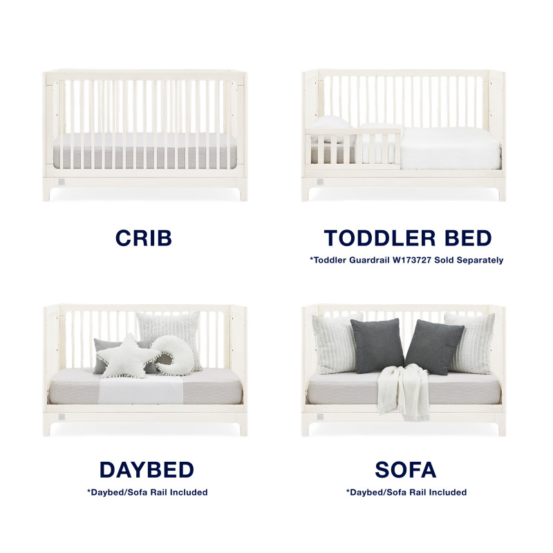 Diseñada para crecer con su hijo, la cuna Charlie se transforma de cuna con colchón ajustable en tres alturas a cama infantil, sofá-cama y, finalmente, sofá (requiere barandilla de niños pequeños W173726 para convertirla en cama infantil, la cual se vende por separado)