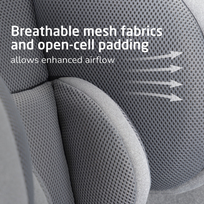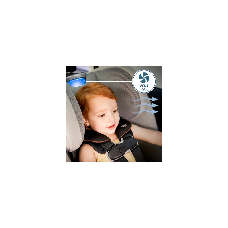 El acolchado especial de celdas abiertas y la tela de malla suave y transpirable permiten que el aire circule alrededor de tu hijo (2 ventiladores en la zona lumbar y 1 en el reposacabezas) para mejorar el flujo de aire y la comodidad. Sabrás que los ventiladores VentMax están activados cuando veas la luz indicadora automática. El sistema VentMax también es resistente al agua (¡no te preocupes por los derrames!), súper silencioso y se apaga cuando se apaga el enchufe del coche.