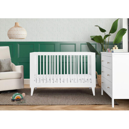 La cuna convertible Ollie 4 en 1 de Delta Children refleja con elegancia el estilo moderno de mediados de siglo gracias a sus líneas limpias, barrotes delgados y patas anguladas.