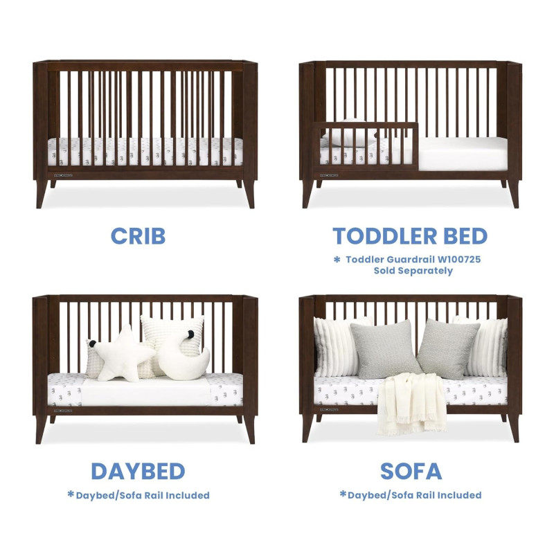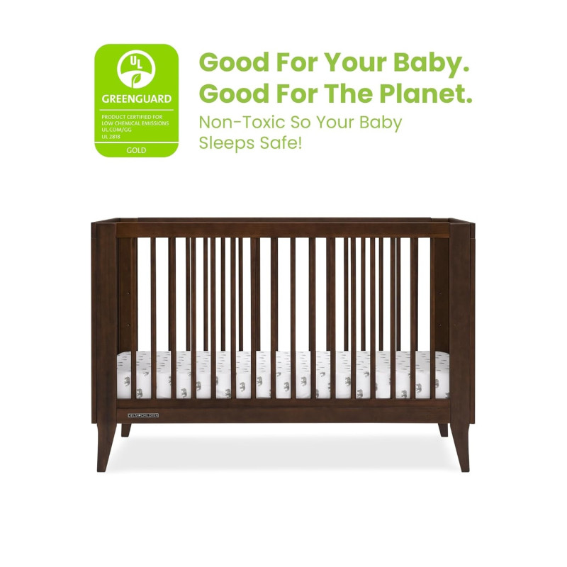 La cuna convertible Ollie 4 en 1 de Delta Children refleja con elegancia el estilo moderno de mediados de siglo gracias a sus líneas limpias, barrotes delgados y patas anguladas.