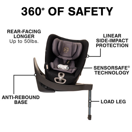 El asiento de automóvil convertible Sirona S cuenta con sistema giratorio 360° lo que hace que cambiar el asiento mirando hacia atrás (en contra marcha) o mirando hacia adelante (a favor de la marcha) sea rápido y fácil con tan solo una mano. Además cuenta con barra estabilizadora (load leg) con diseño antirrebote, protección lineal contra impactos laterales para mayor seguridad y tecnología Sensor Safe para una mayor tranquilidad para los padres.