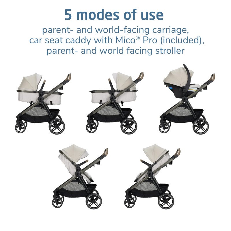 🧭 Sistema 5 en 1: base para silla de auto orientado hacia los padres, coche tipo cuna reversible y coche para niño más grande también reversible.
