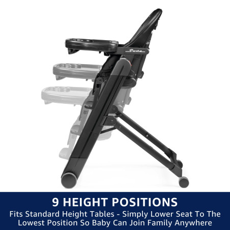 La silla Siesta sigue a un niño desde el nacimiento hasta los primeros años. La silla multifuncional se puede usar como un cómodo sillón reclinable, perfecto para mantener cerca a un bebé pequeño. A medida que el niño crece, las cinco posiciones de reclinado y las nueve posiciones de altura brindan un lugar perfecto para relajarse, comer o jugar. La cena será realmente un asunto familiar, ya que los múltiples ajustes de altura y la bandeja extraíble de Siesta permiten que el niño se siente a la mesa.