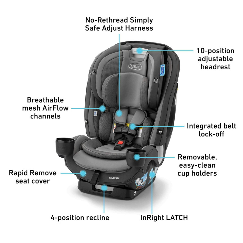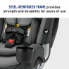 Este asiento de automóvil angosto todo en uno crece con su hijo desde el arnés orientado hacia atrás (5-40 lb) hasta el arnés orientado hacia adelante (22-65 lb) y el asiento elevado con respaldo alto (40-100 lb).