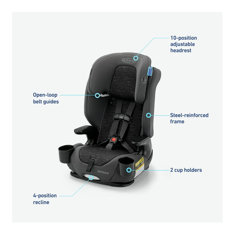 El asiento para automóvil 3 en 1 Nautilus de 2.0 puede usarse desde niños pequeños hasta jóvenes, lo que mantiene seguro a su hijo en crecimiento. Con 3 modos de uso, su hijo puede viajar de forma segura con un arnés orientado hacia adelante de 22 a 65 lb, un asiento elevado con respaldo alto de 40 a 100 lb y un asiento elevado sin respaldo de 40 a 120 lb. El diseño actualizado y más elegante incluye acolchados blandos e InRight LATCH que proporciona una conexión fácil de un segundo con un clic audible para ayudar a garantizar una instalación segura. Su arnés Simply Safe Adjust le permite ajustar el arnés y el reposacabezas juntos a medida que su hijo crece, sin perder tiempo en volver a enhebrar. Apreciará la fuerza del marco reforzado con acero y la reclinación de 4 posiciones para mayor comodidad y ajuste. El asiento elevador para el automóvil también incluye 2 portavasos personales para ayudar a su pequeño pasajero a disfrutar del viaje. El asiento para el automóvil es Graco ProtectPlus Engineered para ayudar a proteger en choques frontales, laterales, traseros y volcaduras.