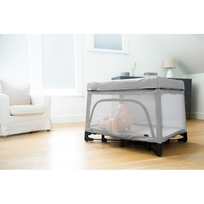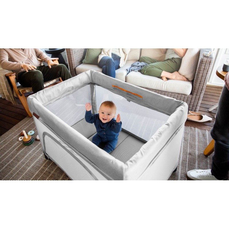 • Panel lateral de malla con cremallera abierta para un acceso rápido y fácil para calmar al bebé