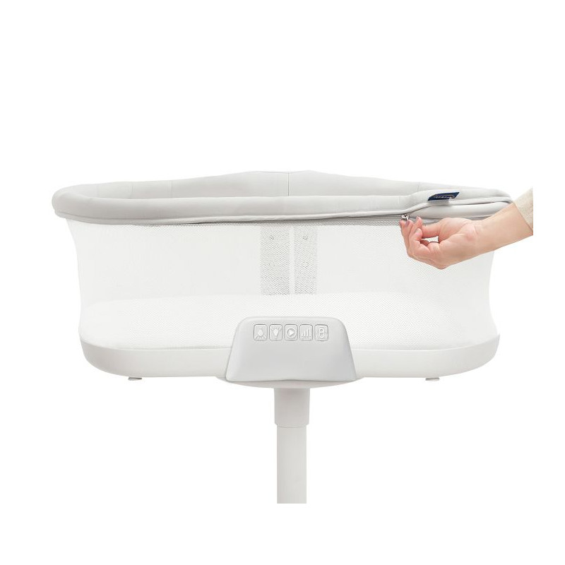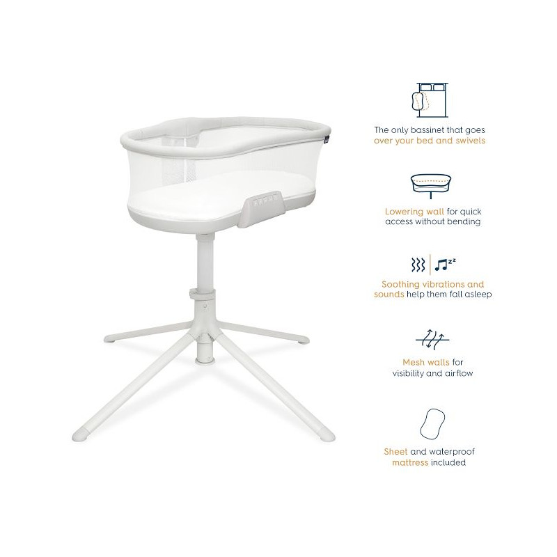 El moisés BassiNest Soothing 3.0 incluye todas las características que les encantan a los padres; Giro de 360° para dormir más cerca, pared de fácil descenso y paredes de malla 100% transpirable. Además, el sistema relajante incluye dos niveles de vibraciones, cuatro sonidos relajantes y luces nocturnas ámbar, todo con apagado automático. Ofrece una base actualizada que es un 30 % más liviana, pero tan resistente como la original. Incluye sábana y almohadilla de poliéster.