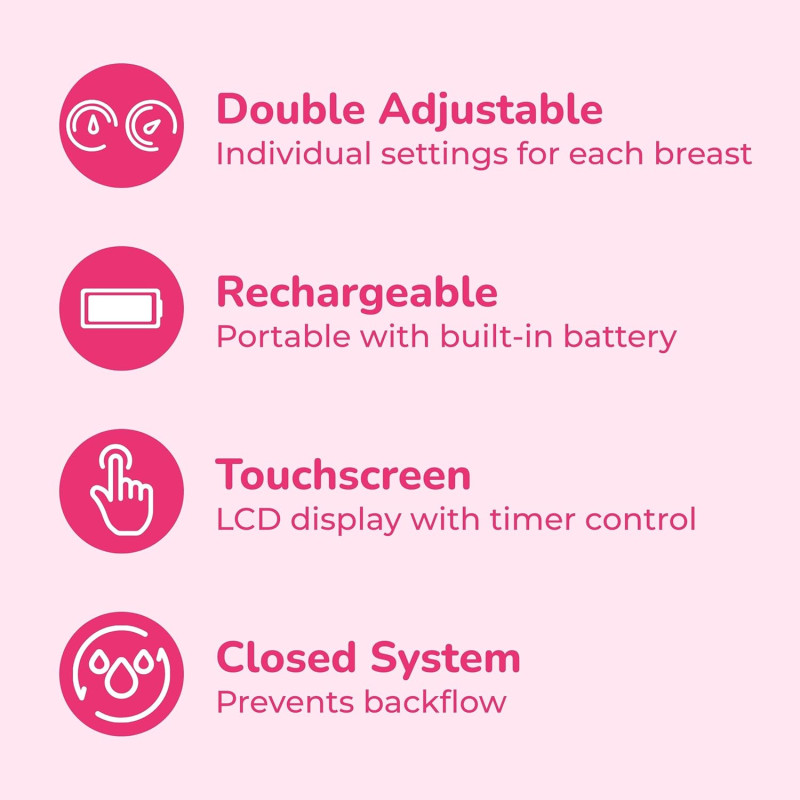 Este extractor ayuda a promover sesiones de extracción cómodas, rápidas y productivas. Es el único en utilizar un sistema de control dual que le permite crear configuraciones independientes de extracción para cada seno gracias a sus dos motores. Posee 5 etapas de configuración del modo de masaje, luz nocturna con iluminación de 3 niveles, LCD de pantalla táctil con control de temporizador, ultra silencioso para una experiencia discreta, función de memoria electrónica. El mini y liviano SG Portable pesa solo 1.5 libras.